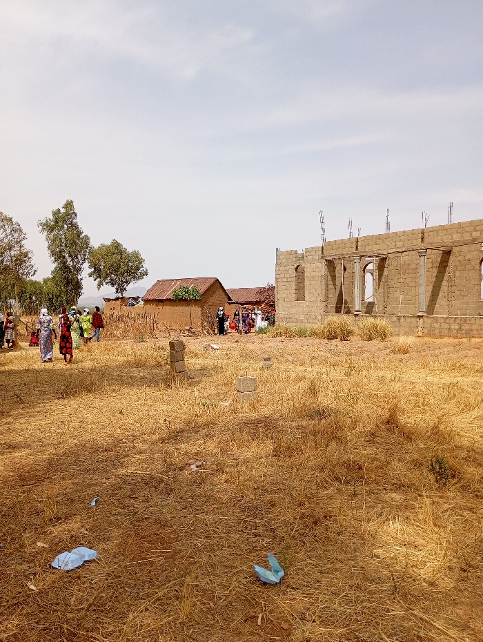 The scene depicts an arid, open landscape in Pankshin, Nigeria. The foreground consists of dry, golden-brown grass and dirt, with several scattered pieces of light blue plastic debris and a few concrete blocks. In the midground, to the left, a cluster of green trees partially obscures a group of approximately 10-15 individuals, primarily women, wearing colorful patterned dresses and head coverings; they appear to be walking or gathering. Central to the midground are several single-story structures with earthy-toned walls and rusty corrugated metal roofs. To the right, a multi-bayed, partially constructed building made of light-colored concrete blocks stands prominently. This structure features several arched openings, integrated columns, and exposed rebar extending upwards, indicating ongoing construction. White fabric or material is visible within some of the arched openings of the concrete building. Another smaller group of people is visible near the mud-brick structures in the center. The background features a pale blue sky with light cloud cover and faint distant hills on the horizon. The environment suggests a dry season with bright daylight.
