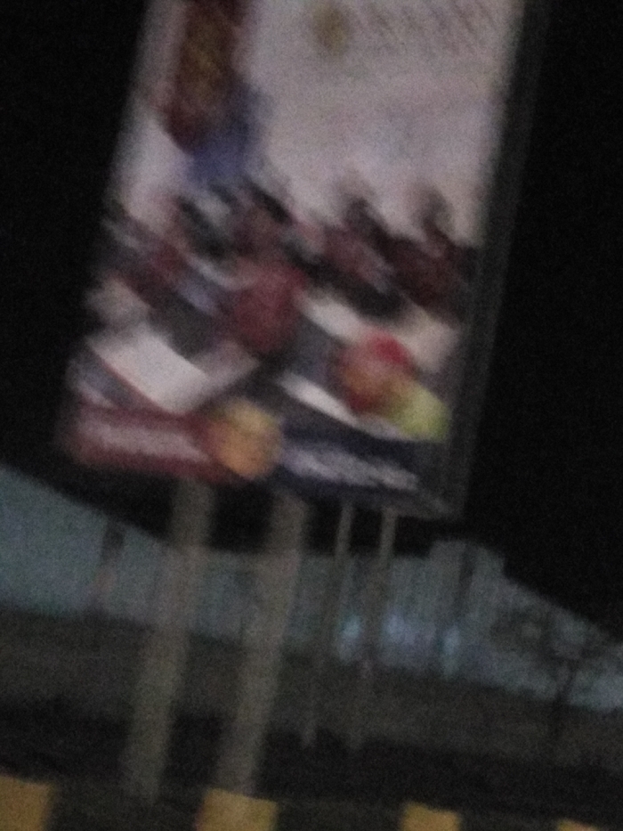 A blurry image shows a vertical sign or billboard with what appears to be a horse racing scene. Multiple horses and jockeys are depicted in a race, with a colorful array of red, blue, and white. The sign is supported by several vertical poles. The surroundings are dark, indicating a nighttime setting. The overall image quality is poor, making it difficult to discern details.
