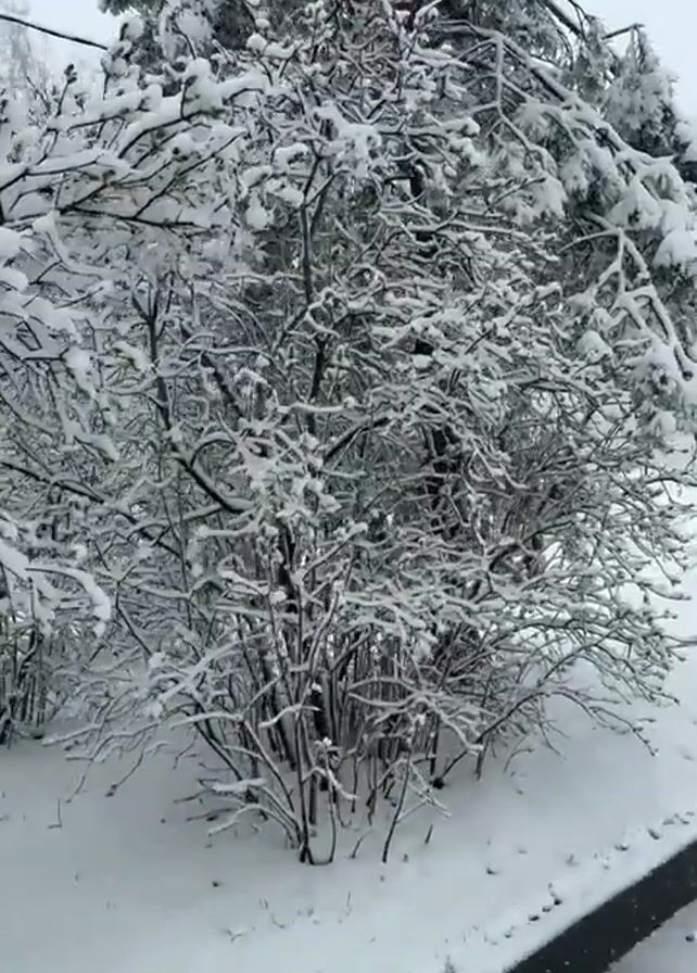 winter scene. It's snowing heavily, and the trees and ground are covered in a thick layer of snow. The camera pans from a snow-covered bush to a wider view of a park or street. There's a brick chimney standing tall in the distance, along with other trees and a small green structure. Tire tracks are visible in the snow-covered street, indicating that vehicles have passed through recently. The overall atmosphere is peaceful and quiet, typical of a snow-covered landscape.
