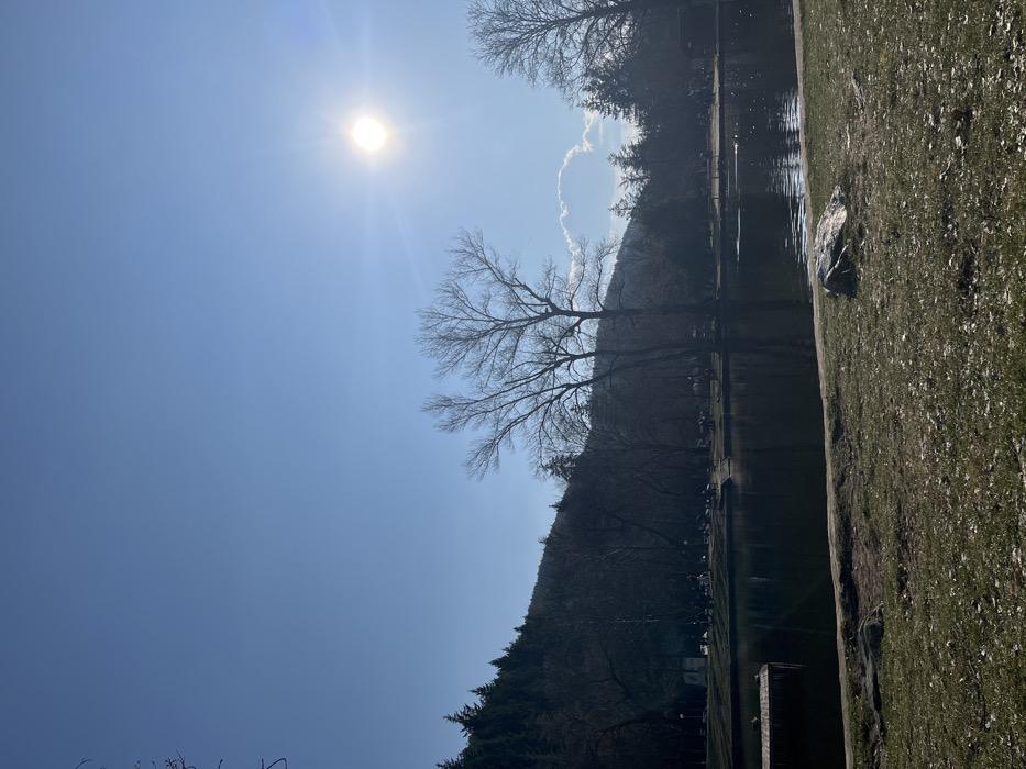 The image depicts an outdoor park scene on a clear, sunny day, identified as Bachinovo Park in Blagoevgrad, Bulgaria. The central feature is a dark, calm lake, reflecting the bright blue sky and surrounding vegetation. The sun, high in the upper right quadrant, emits a strong glare and lens flare. In the foreground, a grassy bank with scattered dry leaves extends across the bottom, featuring a prominent light-colored rock in the lower right. On the left side of the lake, a wooden dock protrudes from the bank, hosting two dark-feathered birds, likely ducks. The midground is dominated by several large, bare deciduous trees, silhouetted against the sky and distant hills. Beyond the lake, a more distant bank is lined with scattered people, appearing as indistinct dark figures, suggesting recreational activity such as walking or picnicking. Faint structures resembling picnic tables and lampposts are visible in this area. The background features steep, densely forested hills, primarily covered with evergreen trees, rising on the left and extending across the center. More evergreen trees are visible on the right side behind the lake. A small, white cumulus cloud is present in the sky above the right-midground trees. The bare branches of the prominent trees suggest a late winter or early spring season.