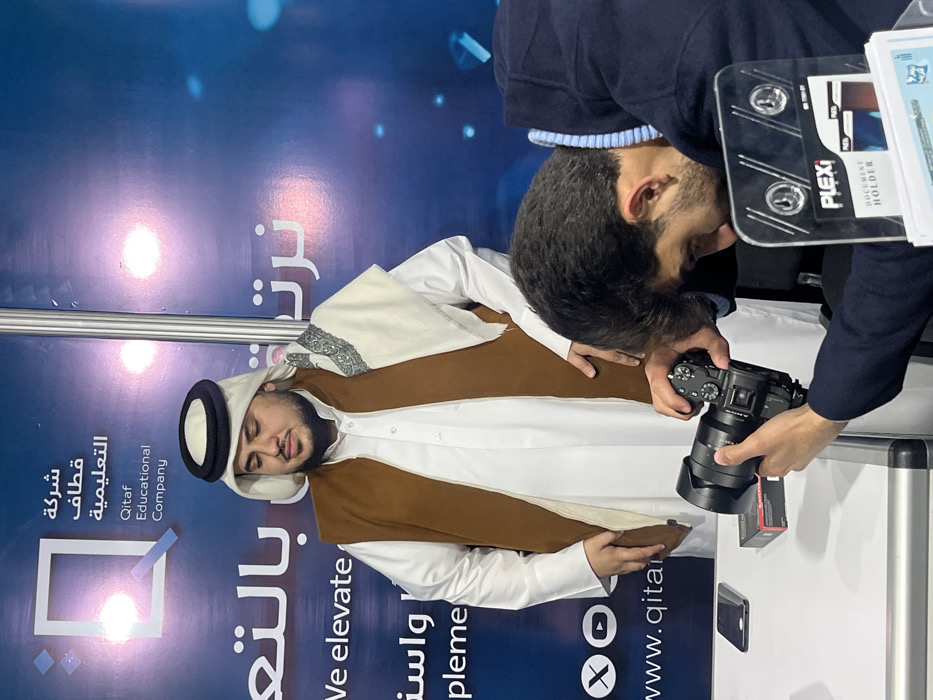 A man in traditional Arab clothing poses for a photo taken by another man holding a DSLR camera. The background features a blue sign with Arabic script and English text that includes "We elevate" and "Qitaf Educational Company." A "PLEXI DOCUMENT HOLDER" is visible in the upper right. The photographer is wearing a blue hoodie. The orientation is vertical.