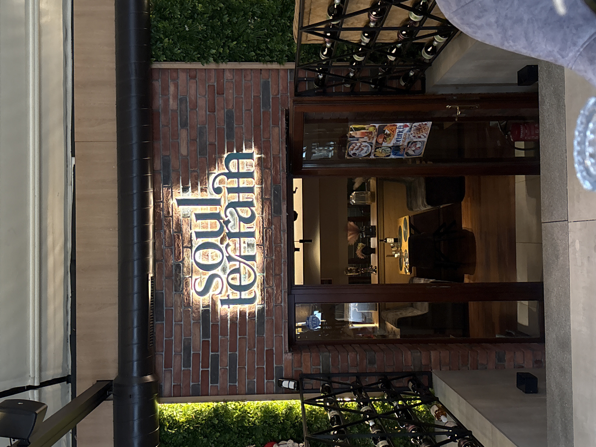The image depicts the entrance of a restaurant named "Soul Terrain," located in Sofia, Bulgaria