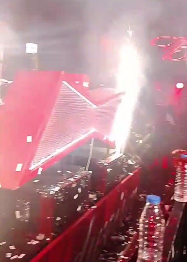 The scene is a nightclub environment, likely a celebration or event. There's a red stage or platform area with a large red lighting fixture shaped like an arrowhead. The platform is strewn with white confetti. In the foreground, a person is holding two bottles of water. Suddenly, a vertical burst of white sparks erupts from the stage area, accompanied by white smoke. A Budweiser sign is visible in the background. The scene suggests a festive atmosphere, likely at a DJ performance.