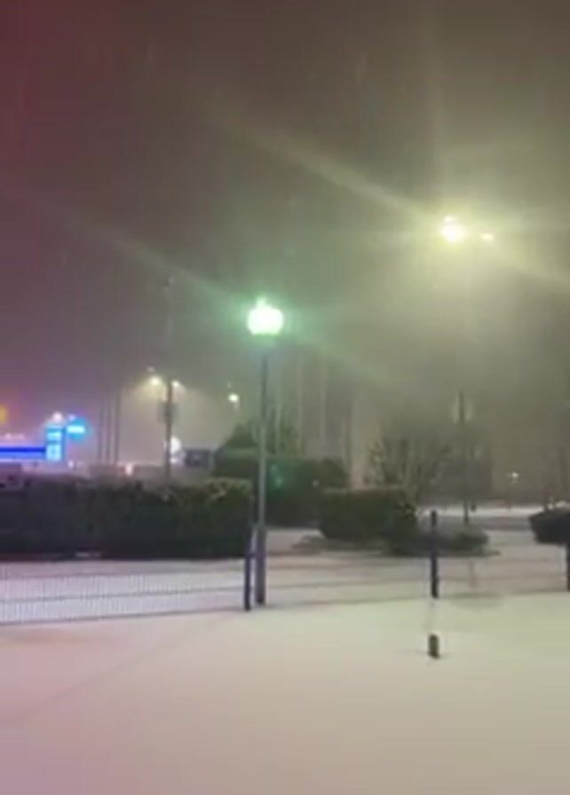 snow-covered landscape at night. Snow is actively falling, illuminated by streetlights that cast a bright glow and a green light nearby. A fence runs along the foreground of the scene, separating the snowy area from a row of bushes. In the background, signs and buildings with neon lights are visible. Traffic moves in the distance. The camera moves slightly, panning to show more of the buildings and surrounding area.
