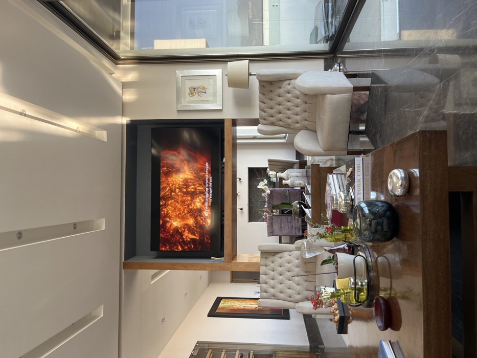 The image depicts the interior of a modern living and dining area located in Santiago Yancuitlalpan, Mexico. The foreground features a glossy dark tiled floor reflecting ambient light and objects. A large rectangular wooden coffee table holds a dark teal glass vessel, a silver spherical ornament, a small reddish-brown dish, a blue book, and a tray containing various small glass vases with red berries/flowers, a small plant, and incense sticks. Behind this, a second wooden coffee table displays books, including one titled "NEW YORK CHIC," glass jars, and decorative bottles. Two light-beige upholstered wingback armchairs with tufted backs face forward, positioned on either side of a central wooden and dark gray wall partition. Mounted within this partition is a large flat-screen television displaying an intense, fiery orange image, possibly of the sun, with the subtitle "It's a mind-boggling torturous struggle to escape the sun." To the left, a large framed artwork with a dark and orange abstract design hangs on a light-colored wall. Further left, a glass-fronted cabinet containing wine bottles is partially visible. To the right of the television, a smaller framed abstract artwork with colorful lines hangs above a floor lamp with a cream shade. Beyond the armchairs, a dining area is visible with a table and two upholstered chairs. A white orchid centerpiece rests on the dining table, with a dark fireplace or feature wall behind it. Natural light enters from a large glass sliding door or window on the far right, reflecting an outdoor scene of hills and sky. The white ceiling features multiple recessed spotlights and linear lighting panels. No individuals are present in the scene.