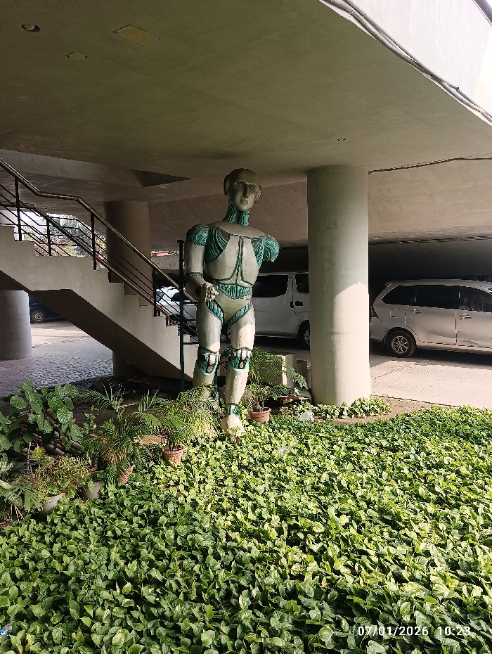 A partial, painted statue of a human-like figure stands in a bed of green plants. The statue is under a building overhang supported by columns, with parked cars visible behind it. A staircase with metal railings is located to the left of the statue. The plant bed appears overgrown and covers much of the ground surrounding the statue. A date stamp is visible in the lower right corner.