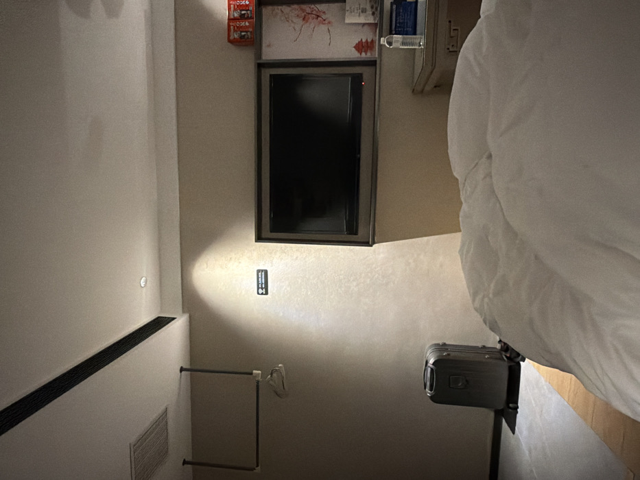 The image displays a dimly lit interior room, identified as a hotel room located in Chaoyang District, China. The perspective is from a low angle, with a large section of a white duvet visible in the bottom right foreground, indicating a bed is present. A wall-mounted television with a black screen, framed in dark material, occupies the central mid-ground. To the right of the television, a light-colored bedside table holds a clear plastic water bottle, several paper items, and two small red box-like objects. To the left of the television, a rectangular sign with white icons, including a 'no smoking' symbol, is affixed to the wall. Above this sign, a recessed spotlight casts a bright, conical beam down the textured beige wall. Below the sign, a grey hardshell suitcase with wheels stands upright on a dark floor. Above the suitcase, a minimalist clothes rack made of metal piping extends from the ceiling, holding one white plastic clothes hanger. The white ceiling features a long, black linear air vent and a square air vent. No individuals are present in the scene.