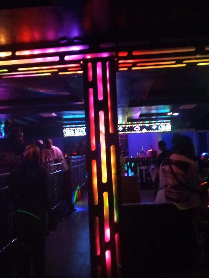 A dark nightclub interior is illuminated with colorful LED lights. A decorative column with vertical cutouts radiates pink, orange, yellow, and green hues. Overhead, a row of similar lights displays a spectrum of colors. In the background, blurred figures suggest people socializing. A bar area with glowing accents is visible, adding to the lively atmosphere of the establishment.