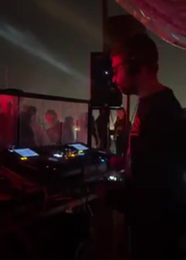A man wearing a black shirt and headphones is standing in front of a DJ console with Pioneer equipment. He is adjusting the controls of the console. Behind the console is a see-through screen with multiple indistinct figures of people, likely a crowd. A large speaker is positioned behind and to the right of the man. The scene is dimly lit with red lighting, creating a club-like atmosphere. Part of a transparent or semi-transparent material hangs above, possibly a tent or decorative fabric. The location seems to be indoors, possibly a club or event space.