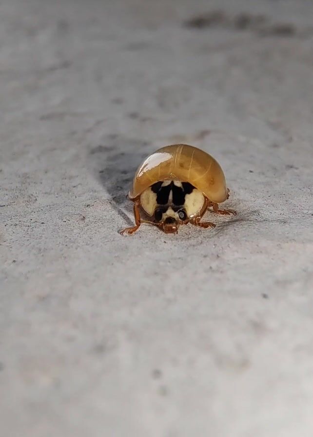 close-up of a pale yellow ladybug on a gray surface