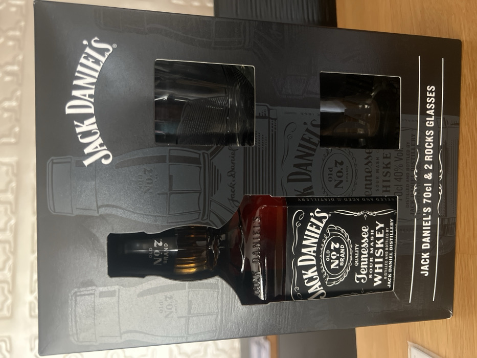The scene depicts a Jack Daniel's Old No. 7 Tennessee Whiskey gift set, positioned on a light brown, possibly wooden, surface. This location is identified as being within Ravda, Bulgaria. The gift set consists of a black cardboard box with prominent white "Jack Daniel's" branding at the top and "JACK DANIEL'S 70cl & 2 ROCKS GLASSES" at the bottom. The box features two rectangular cut-out windows: one prominently displaying a 70cl bottle of Jack Daniel's Old No. 7 Tennessee Sour Mash Whiskey with its characteristic black label, white text, and dark amber liquid, and the other revealing two clear 'rocks' glasses, each exhibiting a subtle horizontal ribbed pattern. The background consists of a light-toned wall featuring a raised, intricate pattern, and a dark, indistinct object partially visible to the right side of the frame. No individuals are present, and no active interactions are occurring; the objects are stationary.