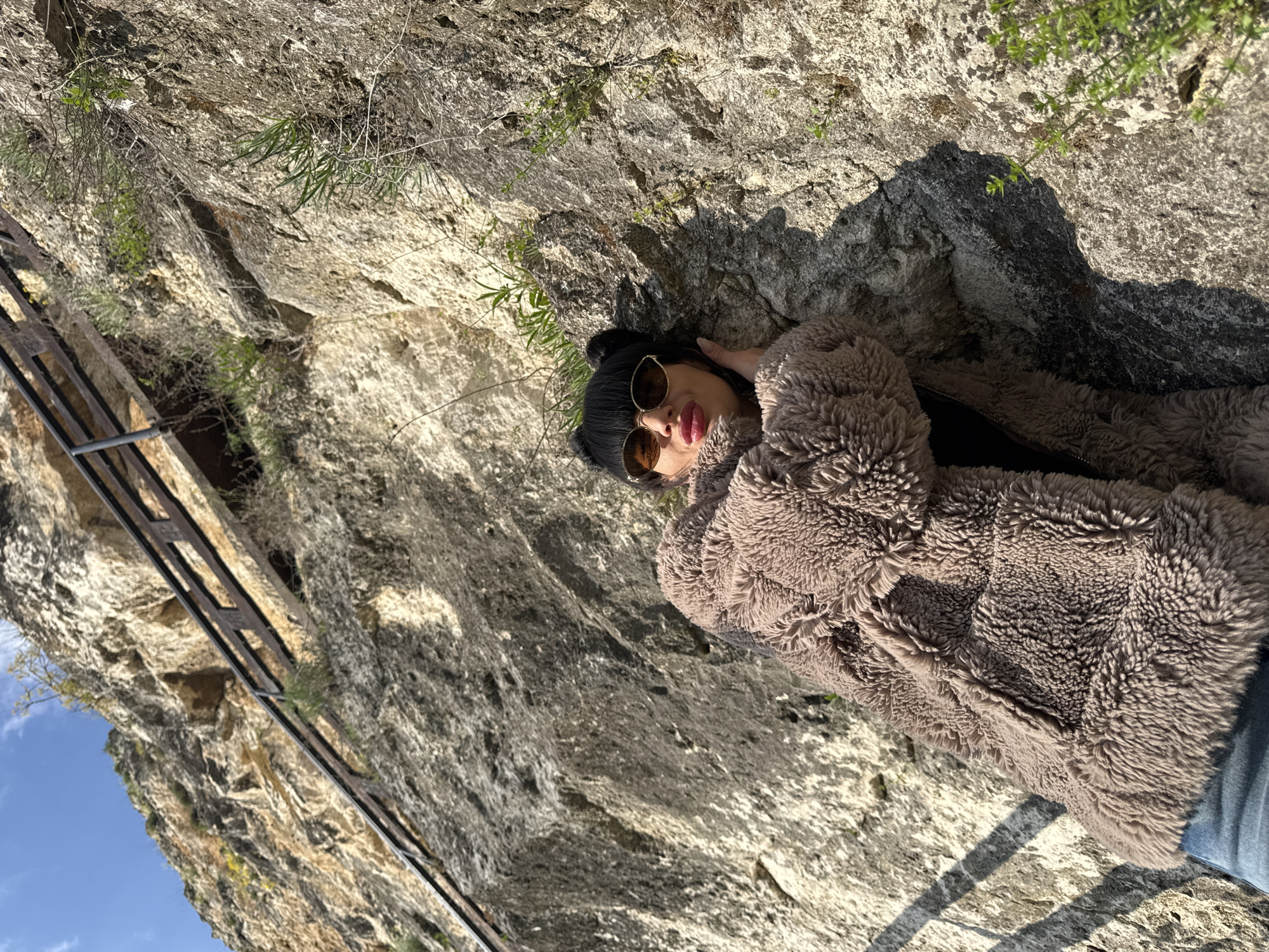 A woman with dark hair and sunglasses is posed lying on a rock surface in the Basarbovo Monastery complex in Basarbovo, Bulgaria. She is wearing a brown, furry coat. A portion of a metal staircase is visible to the left, ascending the rock face. The environment consists of a textured rock wall with some sparse vegetation. The sky is visible at the upper left of the image.