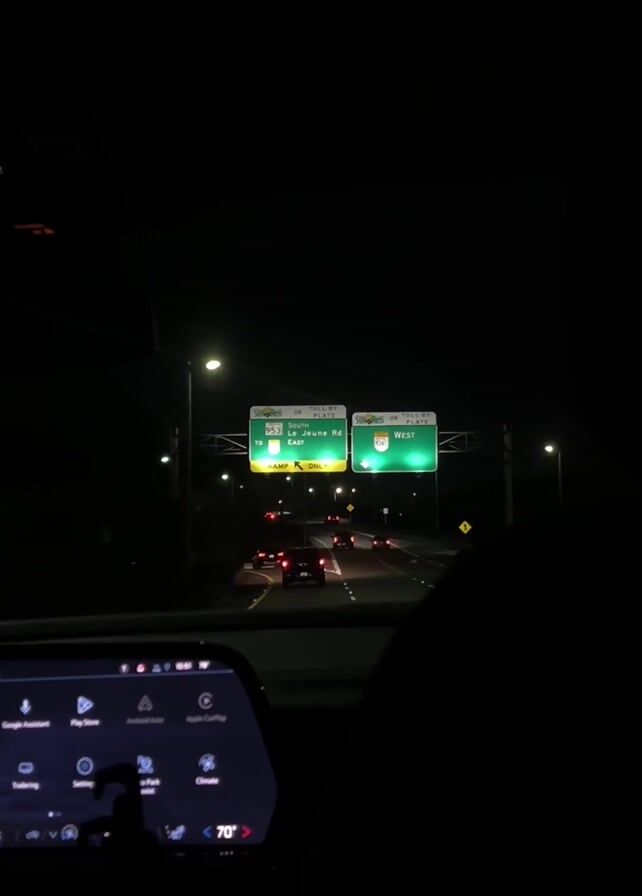 car dashboard view at night. The vehicle is moving on a highway, with other cars visible ahead. Overhead road signs indicate exits for 953 South to Le Jeune Road East and 836 West. The car's infotainment screen is visible, displaying options like Google Assistant, Play Store, and Climate control, with the internal temperature set to 70 degrees.
