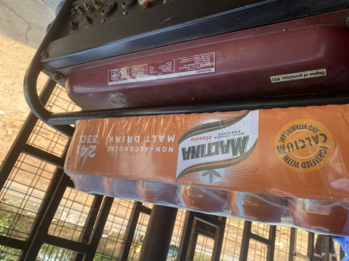 An outdoor scene in Okura, Nigeria, depicts a shrink-wrapped carton of Maltina Classic non-alcoholic malt drink resting on a red and black portable generator