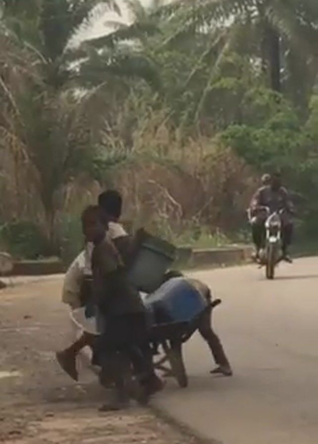 The video depicts a group of children pushing a wheelbarrow filled with blue plastic containers along a paved road in a rural area with lush vegetation. One child carries a container on his head, while others push and pull the wheelbarrow. A person rides a motorcycle on the road. The children appear to be working together, and their expressions are difficult to discern. The environment consists of palm trees and other dense greenery.