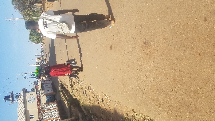 This image depicts a street scene in Jos, Nigeria, under clear, sunny conditions. The perspective is from slightly above ground level, looking down a light brown, possibly asphalt or paved road that stretches into the distance. In the foreground, slightly to the right, a person is walking away from the camera. This individual is wearing a white short-sleeved t-shirt with the word "TECATE" printed in black on the back, dark trousers, and light-colored sandals. A patterned shoulder bag hangs across their back. Further down the road, closer to the left side of the frame, another person is walking. This individual is dressed in a long-sleeved red garment, possibly a dress or tunic, and dark footwear. They are carrying a substantial, colorful, bundled assortment of goods balanced on their head. Additionally, they carry multiple dark-colored bags in each hand, appearing to be engaged in street vending or transport. To the left of the road, a dirt shoulder with sparse grass separates the road from a perimeter fence. Beyond this fence is a multi-story building with a light-colored facade, dark roof, and windows. A black water tank on a metal stand is visible on the roof of this building. The fence features an orange and white geometric pattern. Numerous utility poles with overhead power lines line both sides of the street, extending into the background. In the distance, other buildings and sparse trees are visible, along with several vehicles indicating an active thoroughfare. Shadows from the people and roadside structures are cast on the road surface, consistent with the sunny environment.
