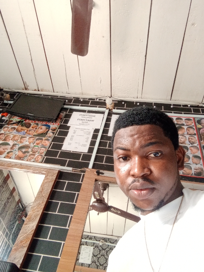 An upward-angled photograph captures an adult male in what appears to be a barbershop in Ughelli, Nigeria