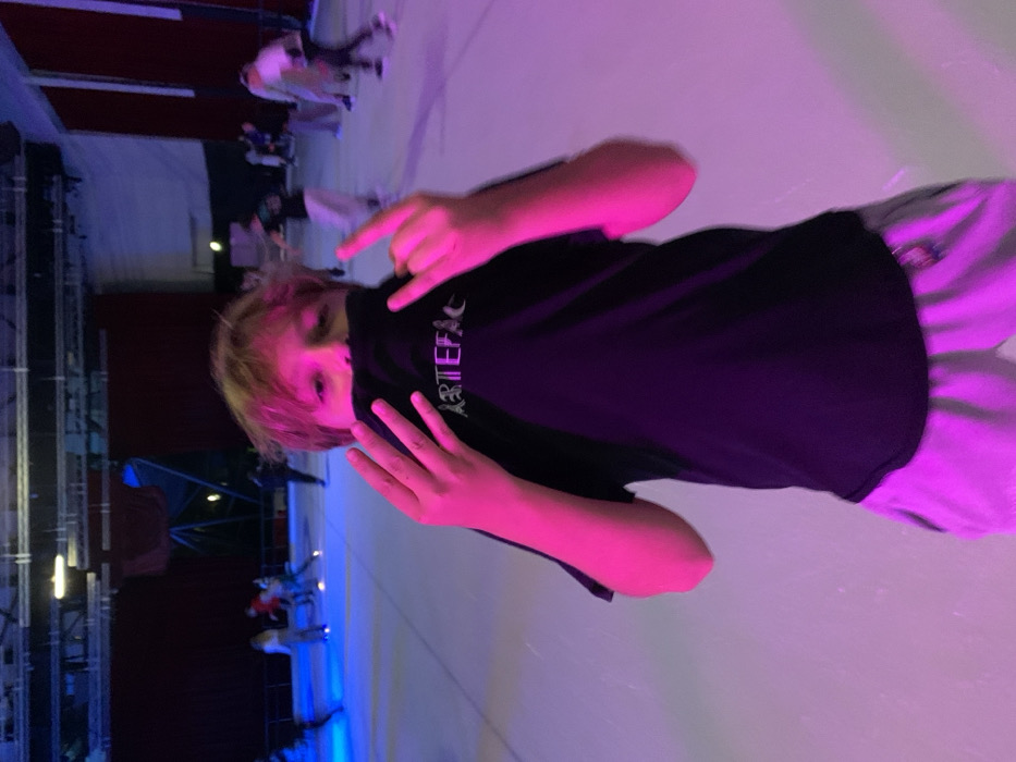 An indoor ice skating rink, likely the Patinoire de l'Iceberg in Strasbourg, France, is depicted under artificial, colored lighting, predominantly magenta and blue. In the foreground, a young individual, possibly male, with light brown hair, stands on the ice. They wear a black t-shirt with a stylized white text "ARTEFACT" and grey shorts. The individual holds the bottom of their t-shirt up to cover their mouth and nose. Their right hand is raised, forming a "rock on" gesture with the index and pinky fingers extended, while the left hand is open with fingers spread, also raised. Their eyes are visible above the shirt. In the background, several blurred figures are visible actively ice skating, indicating other patrons on the rink. The upper background features dark red drapes or banners and visible metal support structures or scaffolding, consistent with an indoor arena.