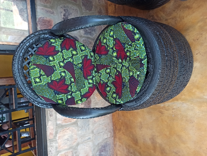 Two chairs made from stacked car tires, painted black, are side-by-side on a tan floor. The seats are fitted with round cushions covered in a colorful fabric featuring green, yellow, and red floral patterns. Each chair has a curved backrest also fashioned from a tire. They sit near a wall composed of light-colored stones and a window.