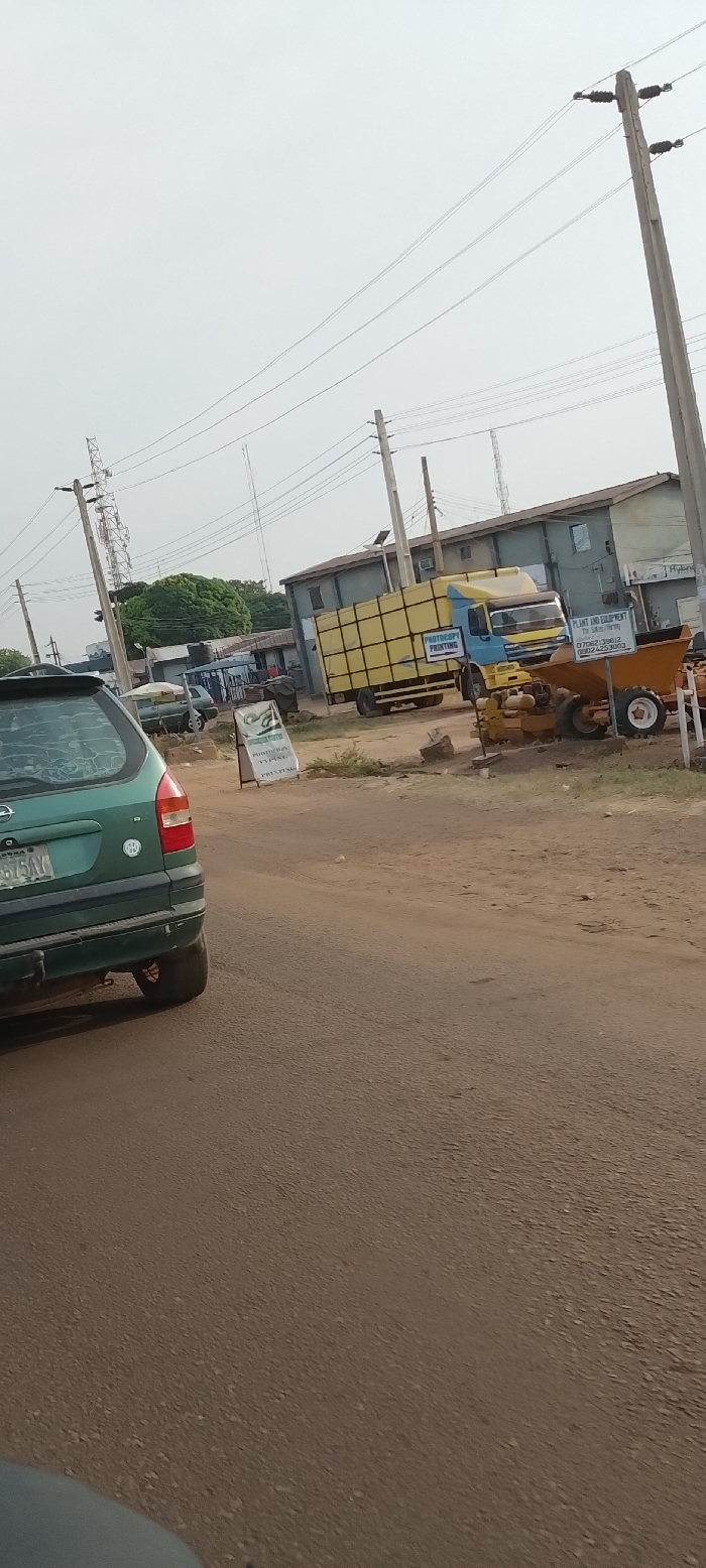 A green Opel car is on a dusty road, with its rear visible. A yellow truck marked "Photocopy Printing" is parked near a building. An advertisement board and some machinery are beside the truck. Power lines stretch across the sky, supported by concrete poles and towers. The sky is overcast and gray.
