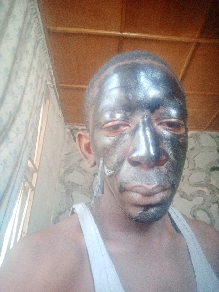 close-up, frontal view of an adult male in a room located in the city of Unknown, Unknown. The individual has dark skin, short dark hair, and is wearing a white ribbed tank top. A dark, reflective facial mask covers most of his face, with visible peeling occurring on the left cheek and chin. The eyes are open and directed towards the camera. The background on the left reveals a window with horizontal bars, partially covered by a light-colored patterned curtain. On the right, a textured wall with grey and white tones is visible. The ceiling is constructed from wooden panels.