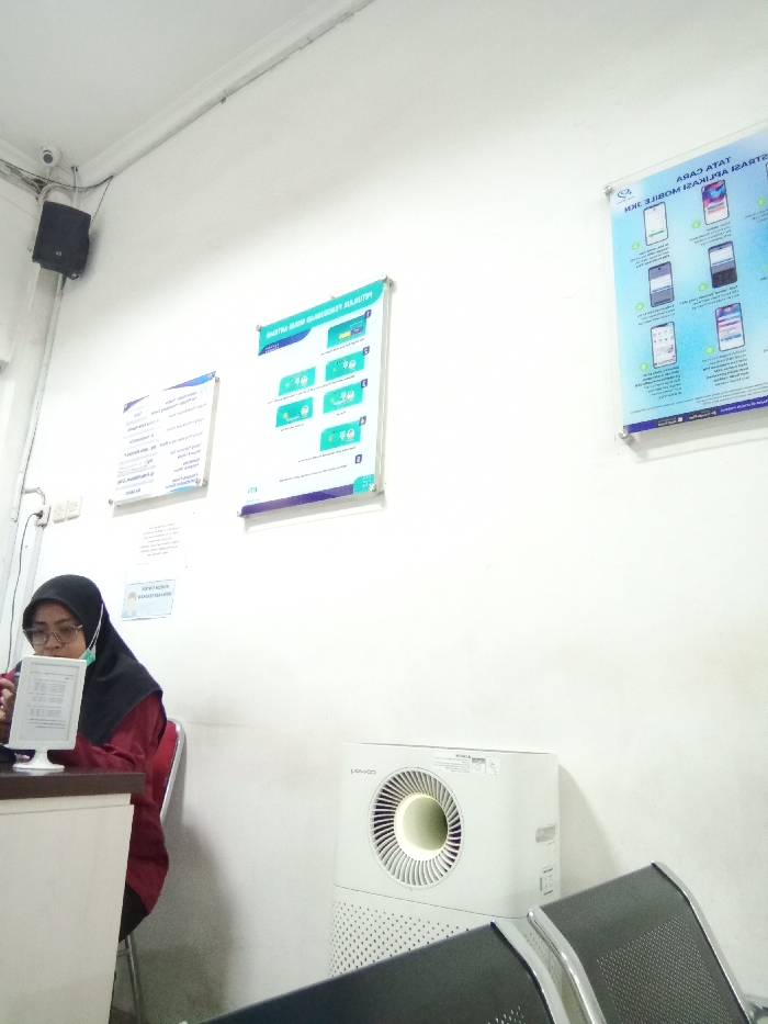 waiting room, located at the coordinates -6.964, 110.247 in Kecamatan Kaliwungu Selatan, Indonesia. The room is sparsely furnished with two chairs and a white air purifier. A woman is sitting in a chair facing a desk with a white frame on it. There are two posters on the wall, one showing the steps to register a SIM card and another featuring a series of mobile apps. There is a white ceiling and the walls are painted white. The room is lit by natural light. The woman is wearing a dark green headscarf and a red shirt. She appears to be reading information on the white frame. The chairs are metal framed with black upholstered seats. The air purifier is a white rectangular shape with a circular air filter. The posters appear to be advertising products and services.