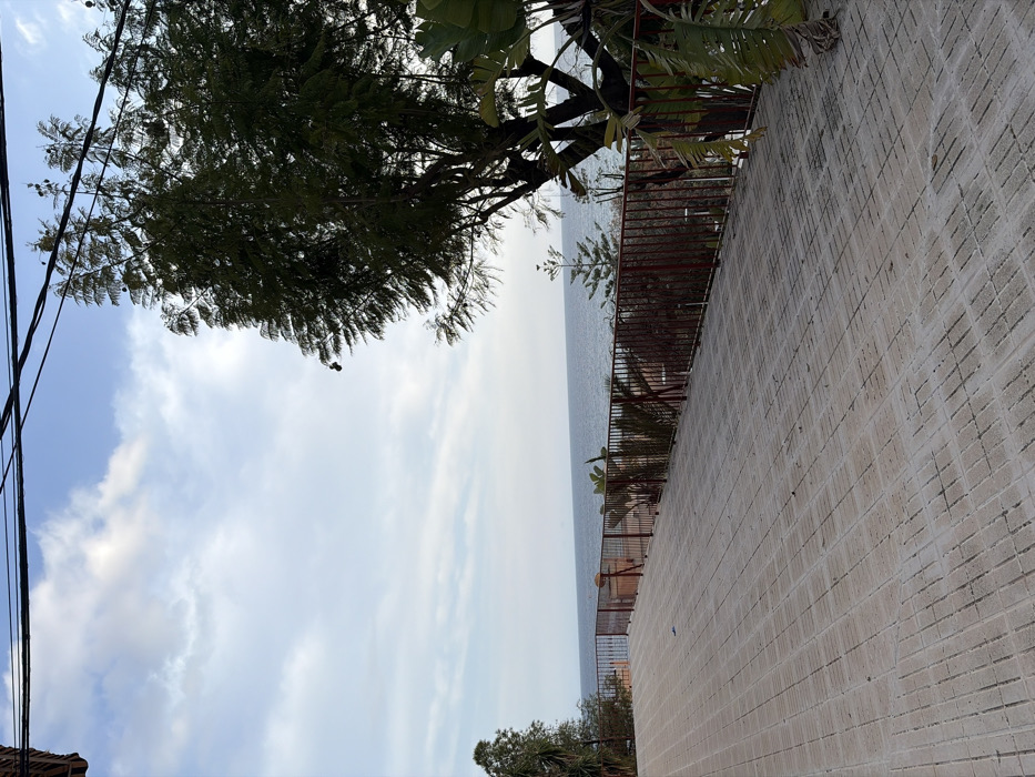 The image displays an elevated coastal scene in Villajoyosa/la Vila Joiosa, Spain, overlooking the Mediterranean Sea. The foreground features a wide, level surface paved with light-colored rectangular interlocking pavers, exhibiting a subtle downward slope from left to right. A small, blue, unidentifiable piece of debris lies on the pavement near the center. This paved area is demarcated by a dark red metal railing with vertical bars, beyond which a vegetated area slopes down to the sea. The vegetation includes various green plants, prominently featuring large, broad leaves and a slender coniferous tree. The Mediterranean Sea forms the background, appearing calm with a blue-grey hue extending to a visible horizon. The sky overhead is partly cloudy, with scattered white and pale grey clouds against a light blue backdrop. A substantial, dark green tree with dense foliage occupies the right side of the frame, partially obscuring the view of the sea and sky. Black utility wires are visible stretching horizontally across the upper portion of the sky. No individuals are present.