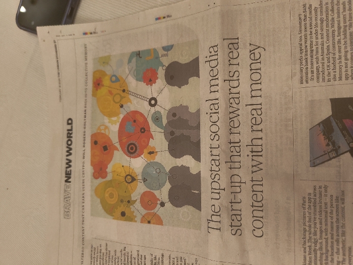 newspaper article titled "Brave New World" about a social media start-up that rewards content creators with real money
