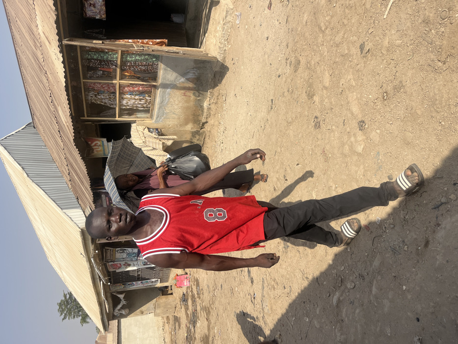 The image portrays an unpaved, dusty street in Dzhidu, Nigeria, under a clear, bright sky, with strong sunlight casting distinct shadows