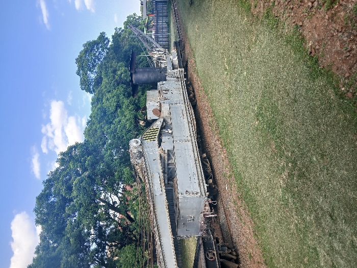 The image displays an outdoor scene under a bright blue sky with scattered white cumulus clouds. A large, vintage, light grey railway breakdown crane, appearing weathered with peeling paint, is the central subject. It is mounted on a multi-axle flatcar, positioned on a set of railway tracks. The crane's boom extends to the left, featuring black and yellow striped hazard markings near its pivot, and a prominent black cylindrical structure, possibly a smokestack, rises from its body. An additional, smaller grey railway car is partially visible to the immediate left, coupled to the crane's unit. Two parallel railway tracks, laid on gravel ballast, traverse the midground. The foreground consists of green grass, with some drier patches of brown earth towards the bottom right. A dense line of mature green trees forms the background, obscuring most distant structures, though a dark fence and indistinct buildings are visible to the right, beyond the tracks. No individuals are present, and the equipment appears stationary and non-operational. This scene is located at the Nairobi Railway Museum, Nairobi, Kenya.