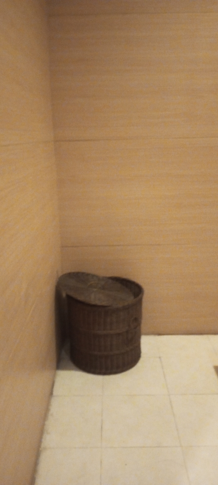 - "The scene is an interior corner featuring a dark brown, cylindrical woven basket with a fitted lid, resting on a light-colored tiled floor" by FM-lrapi1, licensed under CC BY 4.0