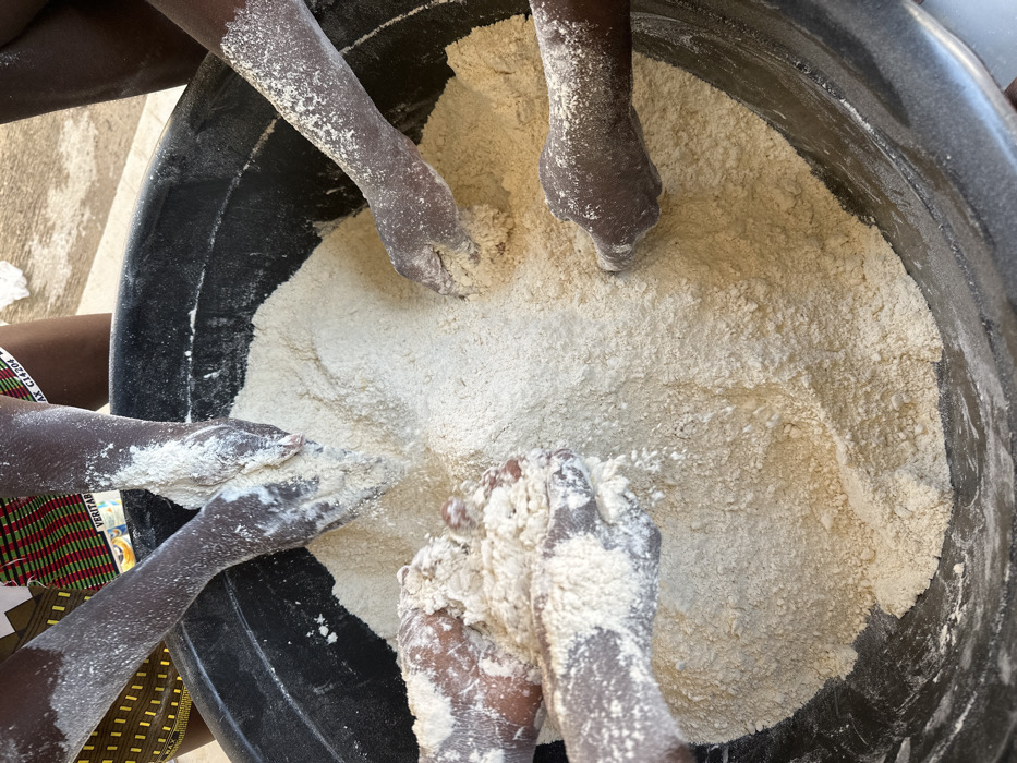 In Jos, Nigeria, an overhead, close-up view captures a large, round, black basin filled with a substantial quantity of fine, off-white granular powder