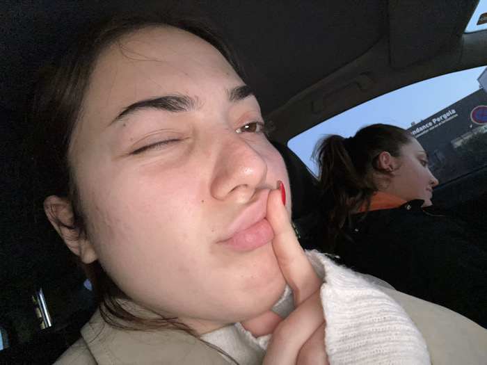 Two adult females are situated inside a vehicle during dusk or early evening. The foreground subject, a young female with dark hair and a light complexion, is winking with her left eye and pursing her lips, forming a "duck face." Her right index finger, featuring red nail polish, is pressed against her lower lip. She wears a light-colored knit sweater and a beige collar. A second young female, with dark hair tied in a high ponytail, is visible in profile in the background, seated behind the foreground subject, looking straight ahead. She wears a dark jacket over an orange inner garment. Through the vehicle's rear window, a dark building is visible under a twilight sky. A white sign on the building clearly reads "Tendance Pergola" and "Décoration et Jardinières." A circular blue and red prohibitory traffic sign is also present near the building. The location is identified as Vendenheim, France, based on the specific business signage.