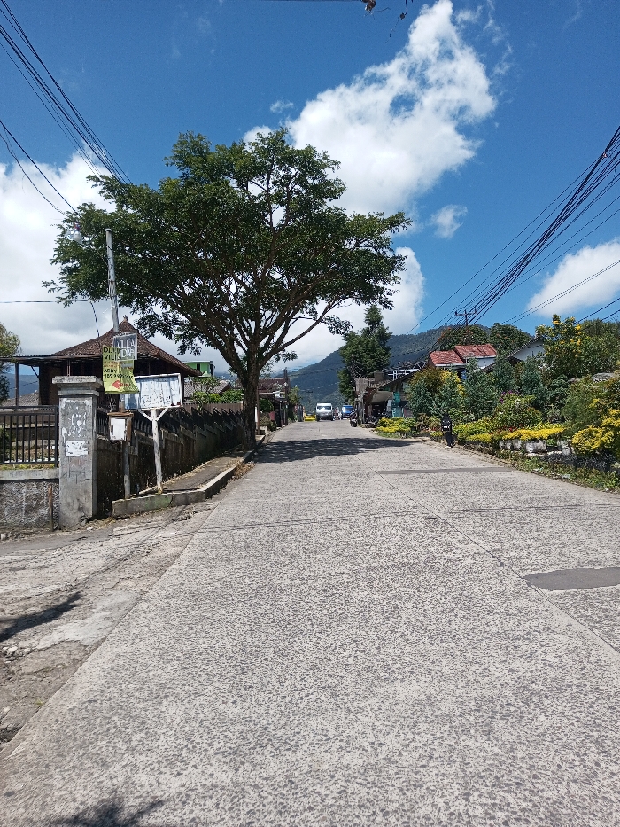 The scene depicts a paved concrete road extending uphill into the distance under a bright blue sky with scattered white cumulus clouds. The location is Bagochen Boolingpang Ueling, Bhutan. A large, mature tree with dense green foliage stands prominently on the left side of the road, adjacent to a utility pole with multiple overhead electrical or communication wires. A concrete fence with a metal gate is visible to the left of the road, behind which a building with a dark, sloped roof is partially obscured by trees. Multiple signs, one partially legible as "VILLA," are attached to the utility pole and fence. On the right side of the road, a raised garden bed contains various green and yellow ornamental plants. Beyond this, several buildings with visible red-tiled and darker roofs are nestled among thick vegetation. In the mid-ground, a white van travels away from the viewer on the road, and a black motorcycle is parked on the right shoulder. Distant mountains covered in green foliage are visible under the sky. Shadows from unseen objects extend across the foreground of the concrete road. No people are visible.