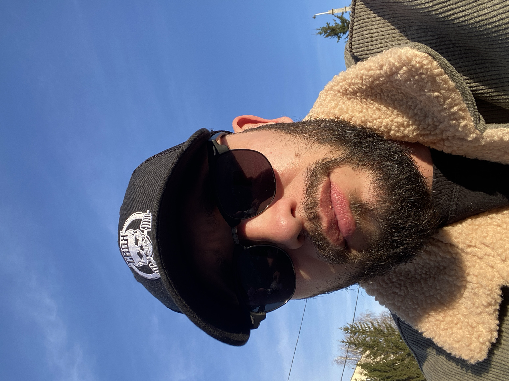 A man is taking a selfie outdoors. He is wearing a black baseball cap with a circular logo, sunglasses, and a corduroy jacket with a cream-colored fleece lining. The sky is blue and clear. In the background, there is a building and a tree. The photo was taken in Chaikovsky, Russia.