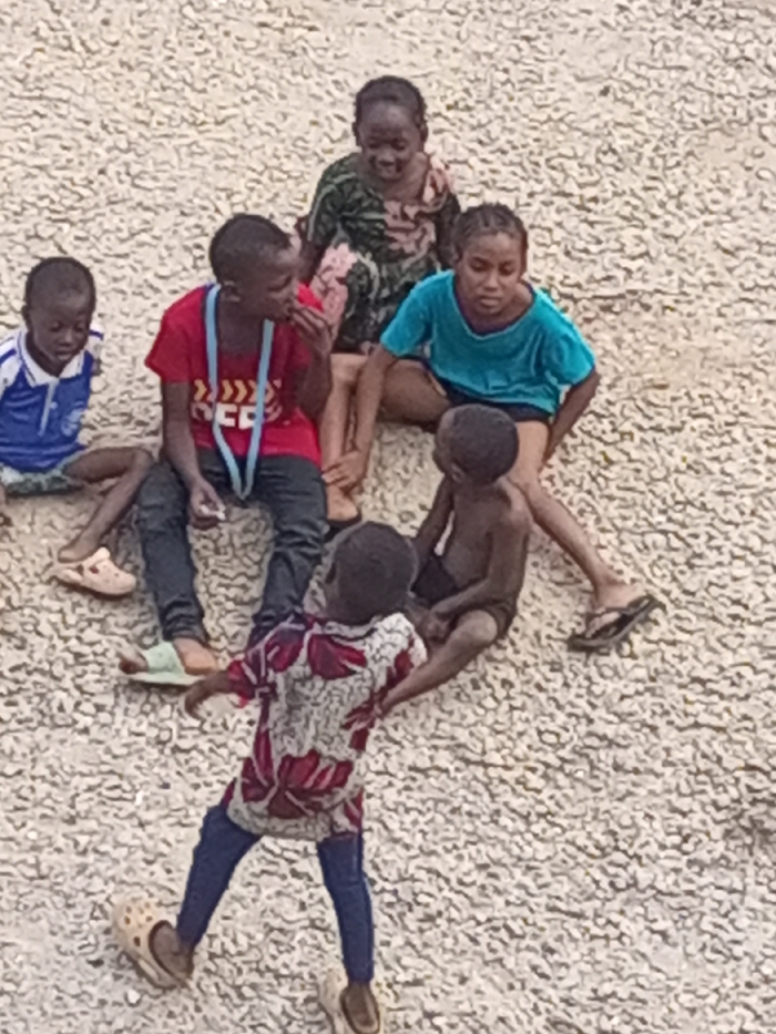 Seven individuals, appearing to be children or young adolescents, are observed on a light-colored, pebbled ground surface in Adankolo, Nigeria