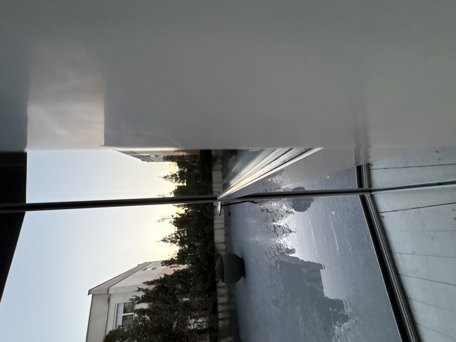 The image displays an exterior urban environment in Sofia, Bulgaria, observed from an interior space through a large glass window or sliding door. The right portion of the frame is occupied by a smooth, light grey vertical interior wall or structural element, while light-colored wooden floorboards are partially visible at the bottom left. A dark vertical mullion and a horizontal window track delineate the transparent glass partition. Outdoors, a flat, light grey rooftop terrace is visible, featuring numerous puddles of water that reflect the sky and surrounding structures. A single, dark green, spherical potted plant is positioned on this wet surface. A low concrete wall separates the terrace from a dense line of tall, dark green evergreen trees, possibly conifers or cypresses. In the background, under a clear sky displaying a gradient from light blue to pale yellow at the horizon, multi-story buildings with light-colored facades are present. The lighting conditions suggest either sunrise or sunset. No individuals or active subjects are discernible within the scene.