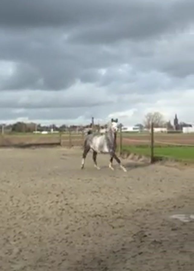 dappled grey horse running in a sandy paddock