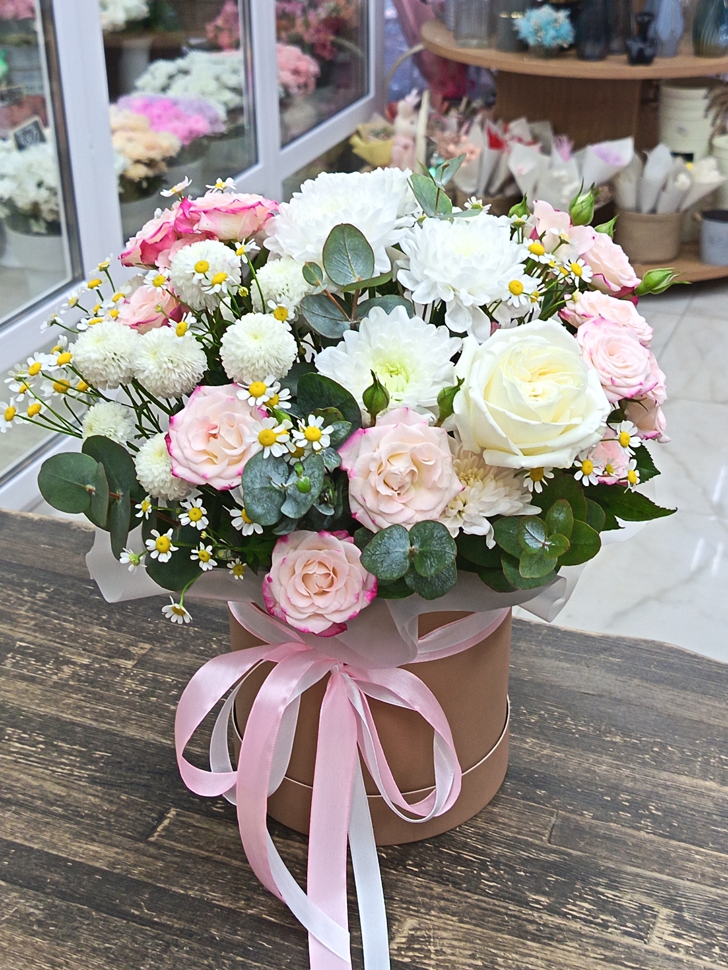 The image depicts a floral arrangement in a round, light brown box tied with a pink and white ribbon. The bouquet contains white chrysanthemums, pink-edged roses, white daisies, and eucalyptus leaves. The box sits on a dark brown wooden surface with a textured grain. The background shows a brightly lit interior, likely a flower shop. Through the window, other floral arrangements are visible. Shelves with vases and flower-arranging supplies are also present in the background. Based on the context of the image, it appears to be taken in a retail setting in Nizhnevartovsk, Russia.