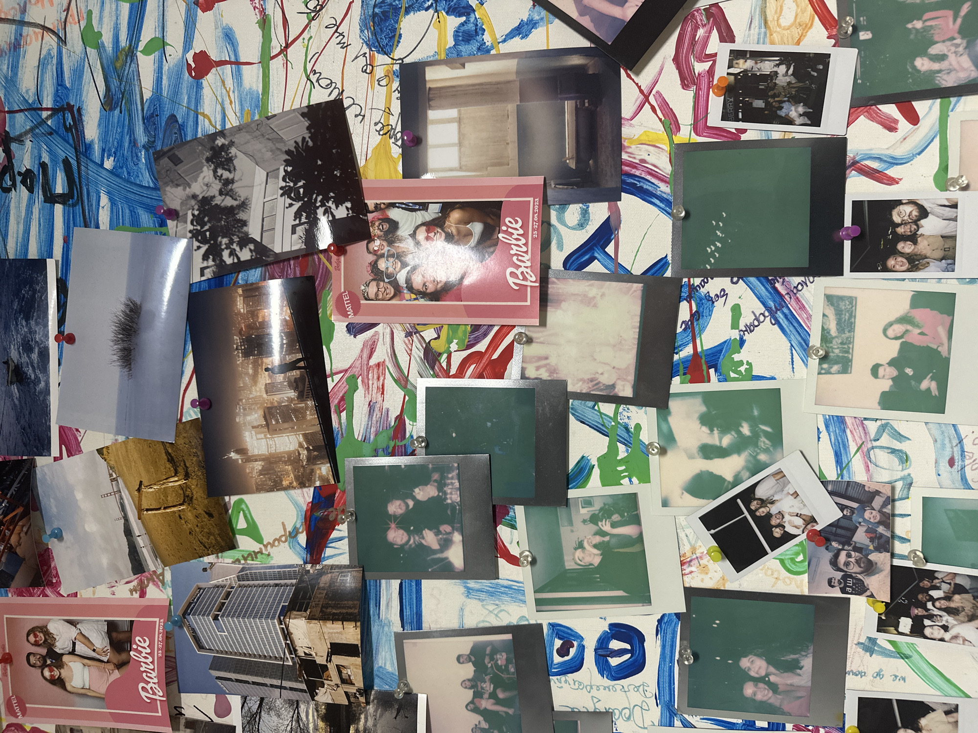 A vertical shot displays a vibrant collage of numerous overlapping photographs pinned to a white surface adorned with abstract, multi-colored paint strokes and handwritten text. The collection includes standard prints, instant film prints (Polaroid style), and photo booth strips, secured by various colored pushpins. **Key elements include:** * **Ramat Gan Location:** A prominent photograph, centrally located on the left, depicts a modern, multi-story glass facade building identifiable as the MATTEL building, situated in Ramat Gan, Israel. Below it, an older, partially dilapidated structure is visible. * **Themed Photo Booth Strips:** Two "Barbie"-themed photo booth strips (dated 25-27.08.2023) feature individuals posing in playful attire, including sunglasses, some smiling directly at the camera. * **Travel and Landscape Photos:** Several landscape photographs are present, including a scenic view of a beach with the Golden Gate Bridge in the background, a snowy landscape with a single bush, and a dramatic night-time cityscape featuring illuminated skyscrapers and a lone silhouetted figure. * **Social Gatherings and Portraits:** Numerous instant film prints and digital photos depict various groups of people in social settings. Subjects include individuals posing in dimly lit interiors, groups at what appear to be parties or bars (some holding drinks), people seated at tables, and close-up portraits of smiling faces. * **Miscellaneous:** Other photos include a black and white shot of a building facade and tree branches, an empty indoor room with a low object, and several instant film prints that appear dark, solid green, or underexposed. The photographs are arranged haphazardly across the painted surface, creating a dense visual record of personal experiences and locations. The underlying surface features broad blue, pink, green, yellow, and red paint strokes, suggesting a dynamic, artistic backdrop to the photo display.