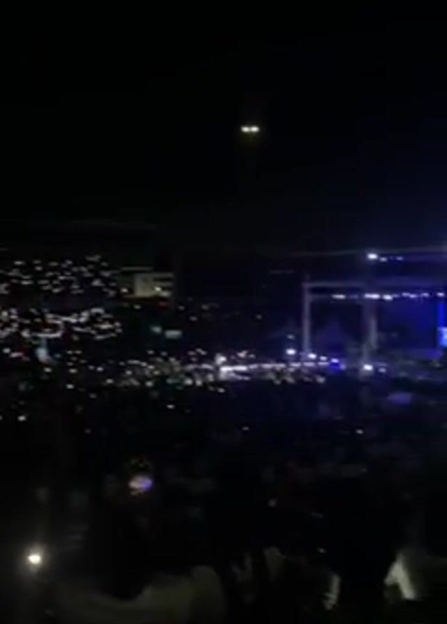 A nighttime video shows a large crowd gathered for a concert