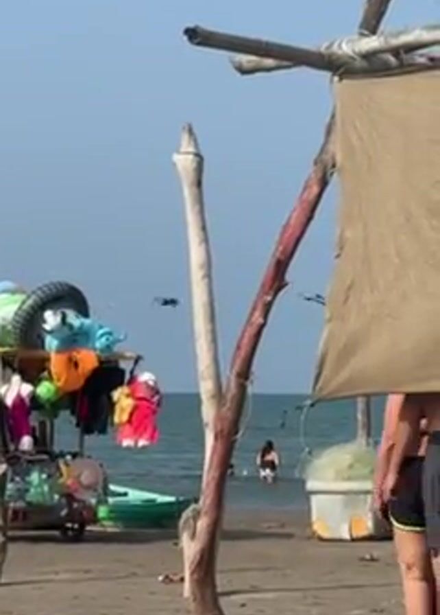 beach scene with various elements. There is a makeshift shelter made of wooden poles and a cloth covering. In the background, people are in the water. A wheeled cart loaded with items like tires, inflatable toys, and clothing is visible. Two people walk across the frame, one shirtless and wearing a cap, the other in a swimsuit. A small white boat is partially in the water, with a ladder attached. A dog also walks into the frame, moving across the sandy beach. The weather appears sunny and the ocean is calm.