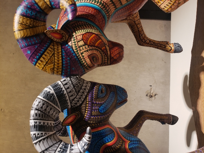 Two intricately decorated wooden ram figurines are stacked vertically