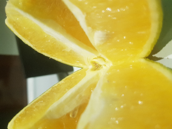 A close-up image depicts a single citrus fruit, likely an orange, partially opened. The fruit is split into multiple segments, fanning outwards from a central core, revealing the vibrant yellow-orange flesh, visible white pith between segments, and the fibrous core. The surface of the fruit appears moist with numerous small specular highlights, suggesting juiciness. The remaining thin peel at the edges exhibits a light green hue. The background is out of focus, showing indistinct dark and light rectangular shapes, consistent with an indoor environment such as a kitchen counter. No people, active actions, or interactions are visible in the scene. The location is in the city of Unknown, Unknown.