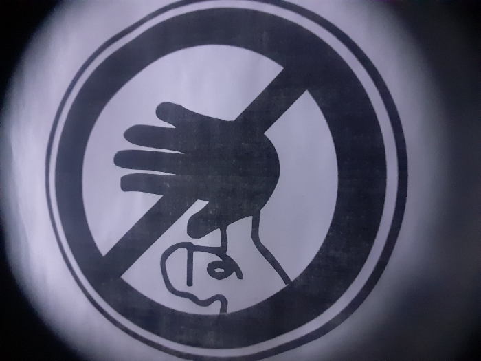 A close-up photograph depicts a prohibition sign against a light background, exhibiting a dark, circular vignette effect around its perimeter. The sign consists of a thick black circular border enclosing a thick black diagonal line extending from the upper-left to the lower-right. Within this prohibited zone, a solid black silhouette of a right human hand is depicted with fingers extended upwards, positioned towards the right side of the circle. To the left, a minimalist line drawing represents a human head in profile with an ear and a simplified arm extending towards the black hand. The diagonal prohibition line crosses over the reaching arm and hand of the line-drawn figure and partially over the black silhouette hand. The surface of the sign appears flat and slightly reflective. There are no discernible environmental cues within the image to corroborate the stated location in Narayi, Nigeria.