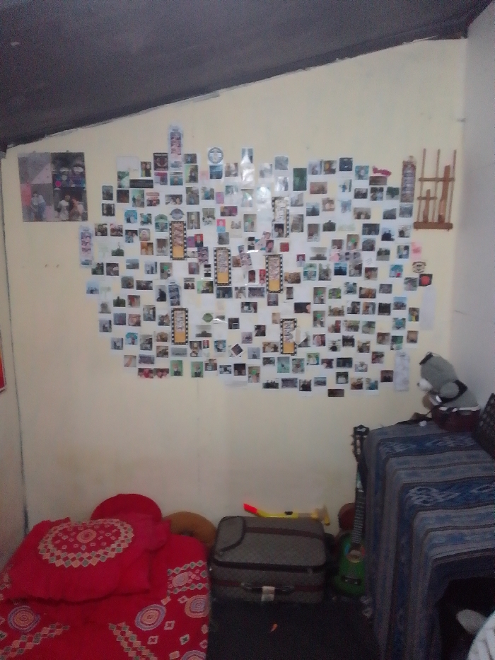 This image captures an interior room, located in Bogor, Indonesia. The room's cream-colored wall is extensively covered by an irregular collage of numerous small, square photographs, likely instant prints, intermixed with a few larger images, posters, and several vertically oriented decorative strips featuring patterned designs. A larger, darker rectangular image or poster is affixed to the wall on the far left. On the upper right, a small, multi-tiered wooden rack or shelf is mounted. The room features a dark, sloped ceiling. In the lower left foreground, a red futon or bed is present, adorned with a patterned red blanket and pillows. A brown, crescent-shaped bolster cushion rests nearby. Centrally on the dark floor, a vintage-style brown suitcase with a repeating pattern and two metallic clasps is positioned. Partially obscured behind the suitcase is a yellow and orange toy gun. To the right, a tall piece of furniture, possibly a dresser or cabinet, is draped with a blue and white patterned textile. A green acoustic guitar leans against this furniture. Perched atop the blue-covered furniture on the far right is a grey stuffed animal, resembling a cat or bear, wearing a red and white striped accessory. No people are visible within the scene.