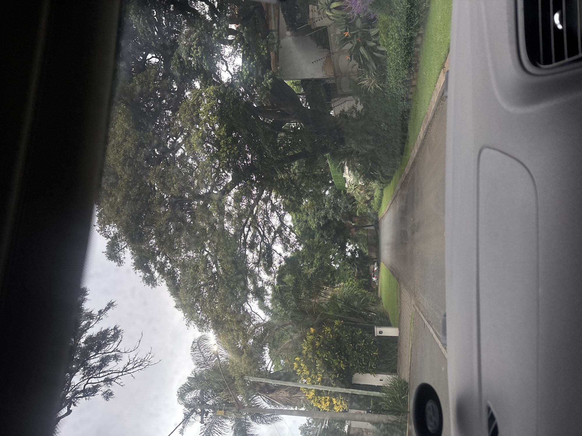 The image depicts a residential street in Durban North, South Africa, viewed from inside a vehicle through its windshield and dashboard. The street is a narrow, asphalt road, appearing damp or wet, extending into the distance and curving slightly to the left. The sky is overcast and light grey. On the left side of the road, dense subtropical vegetation includes tall palm trees and various green and yellow-leafed shrubs. A dark street light pole with an illuminated lamp is visible towards the left foreground. Further along, a white gate post and a rectangular white pillar are present. A light-colored sedan-style vehicle is parked on a driveway partially visible further down the road on the left. On the right side of the road, a large, mature tree with an extensive green canopy dominates the upper right quadrant, its branches extending over the roadway. Below the tree, lush gardens feature various plants, including strelitzia flowers, aloes, and manicured hedges. A white stucco wall, possibly part of a residence, is partially visible behind the foliage, showing a section with security wiring along its top. No individuals are visible in the scene. The dashboard of the observer's vehicle, featuring grey and black plastic components, occupies the bottom portion of the frame.