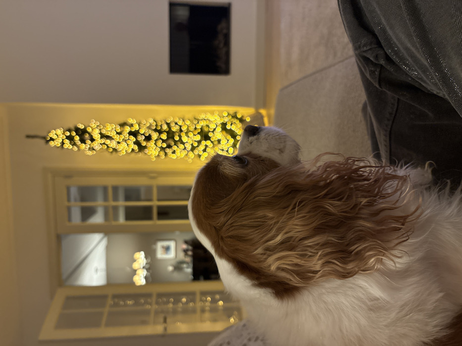 A Cavalier King Charles Spaniel sits close to the viewer. The dog's head is mostly brown and white. The dog is looking up at an out-of-focus, linear display of small, warm lights, likely a Christmas decoration. Behind the lights, partially visible through white doors, is a chandelier. A dark, framed picture hangs on the wall behind the lights. Part of someone's lap, covered in gray denim, is to the right of the dog.