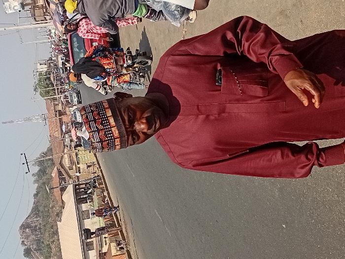 A man in a maroon traditional outfit and a patterned cap stands on a paved street. Behind him is a bustling street scene with cars, motorcycles, and pedestrians. Buildings and power lines line the street, and a mountain is visible in the distance. The day appears sunny.