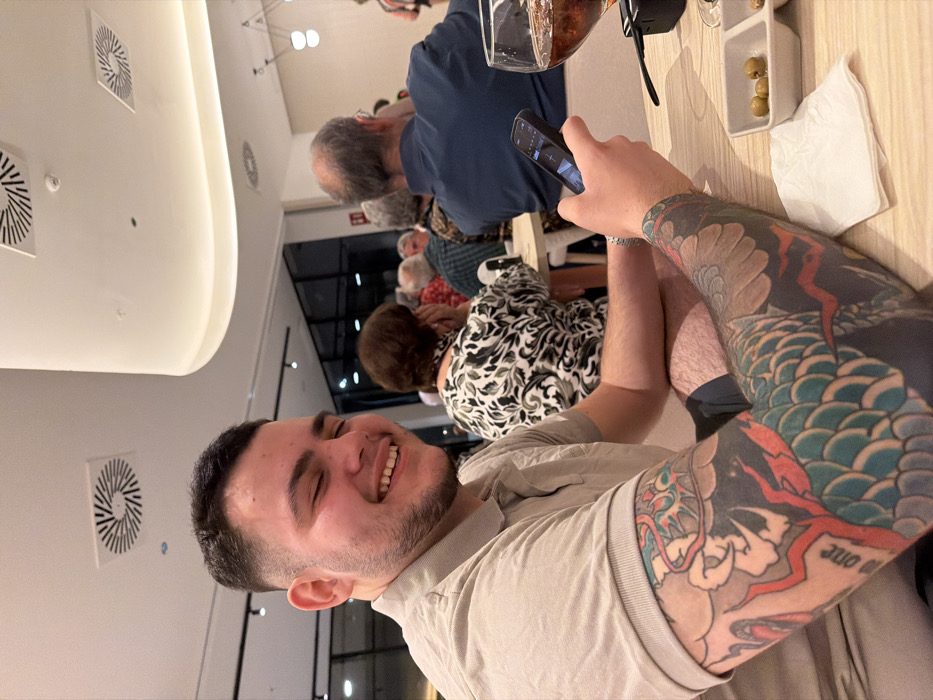 The image depicts an indoor scene within a modern restaurant or bar in Gandia, Spain, observed during evening hours. In the foreground, a young adult male with dark hair and a fade haircut, wearing a light beige polo shirt, is positioned with his torso angled slightly towards the right and his head turned to the left. He is smiling broadly with his eyes closed. His arms are extensively tattooed with colorful designs, including a green scaled pattern on his right arm and a multi-colored motif with the word "ONE" visible on his left forearm. He holds a black smartphone in his right hand, displaying a screen with a graph or data interface. On the light-toned table directly in front of him are a clear glass containing a dark liquid with ice, a segmented white dish holding green olives, and a folded white paper napkin. The background features several indistinct patrons, primarily older adults, seated at other tables. A woman with dark hair wearing a black and white patterned top is visible behind the foreground subject, alongside a bald man in a dark blue shirt, both facing away. The establishment's ceiling is white, equipped with multiple circular ventilation grilles, modern recessed spotlights, and a prominent, curved illuminated light panel. Dark windows are visible in the far background, suggesting an exterior nighttime environment.